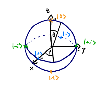 - $\vert + \rangle: \quad \theta = \frac{\pi}{2}, \varphi = 0 \rightarrow$ \(\vec r = \begin{pmatrix} 1 \\ 0 \\ 0 \end{pmatrix}\)